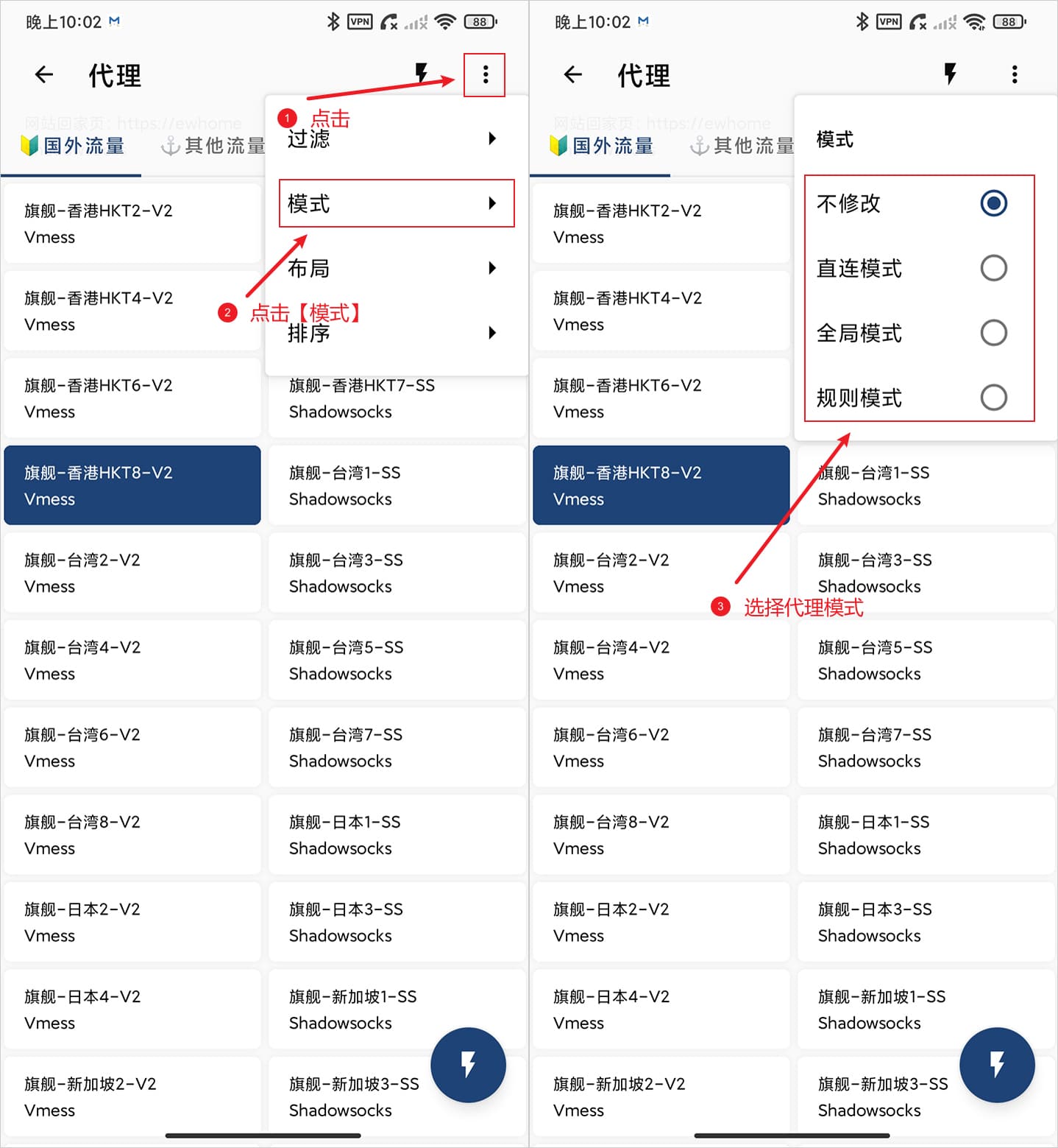 在上图中的代理页面,点击左上角的图标,在弹出的窗口中点击模式,即可切换路由模式,如下图所示。
